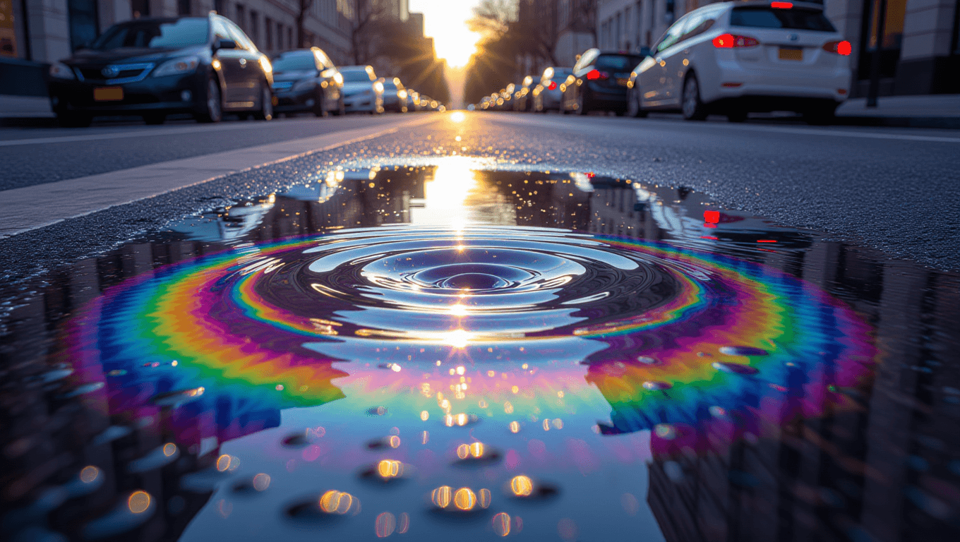 Rainbows on oily puddles are caused by 'thin-film interference,' where light waves reflecting off the top and bottom surfaces of the super-thin oil layer interfere with each other, canceling some colors and boosting others depending on the oil's thickness.**